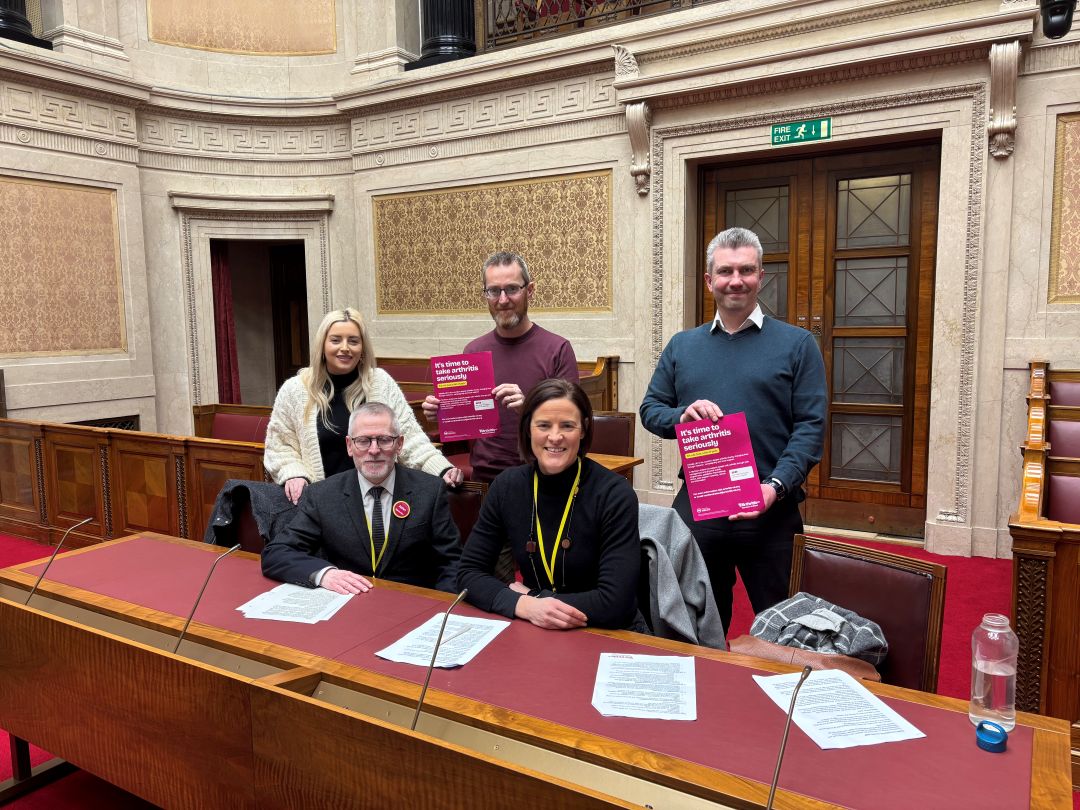 Pictured: Órlaithí Flynn MLA, Philip McGuigan MLA, Danny Donnelly MLA with John McCormick and Sarah Graham of Arthritis UK