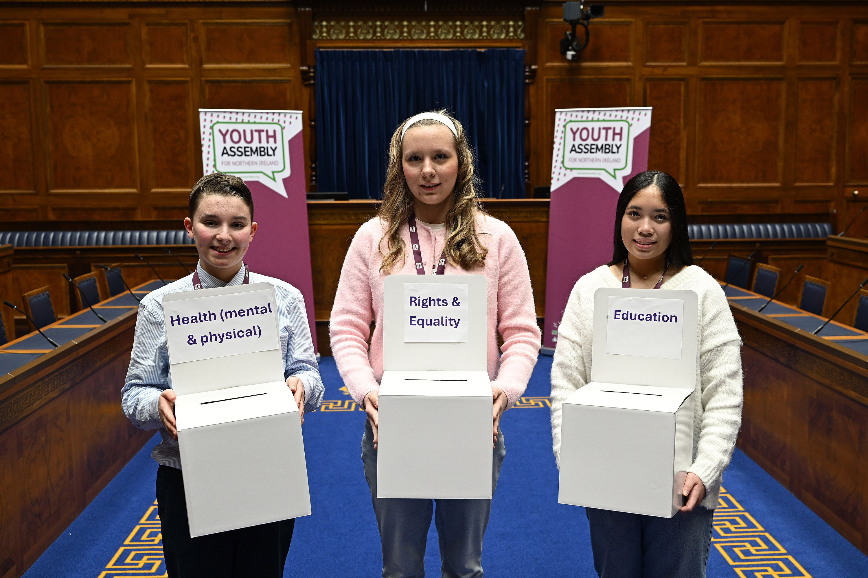 NI Youth Assembly Members Raphael, Tomila and Erynne holding the voting boxes in the Assembly Chamber.